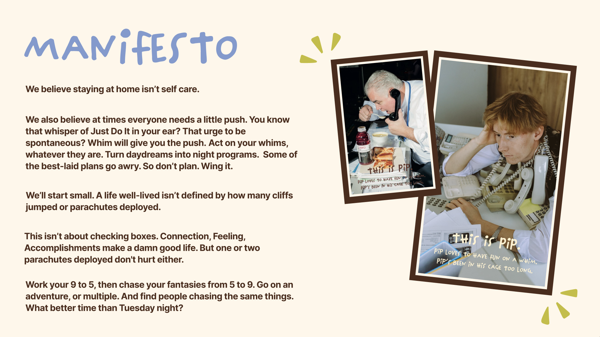 Whim is a social instigator app that gives you weekly adventures and a monthly challenge to make life more spontaneous.